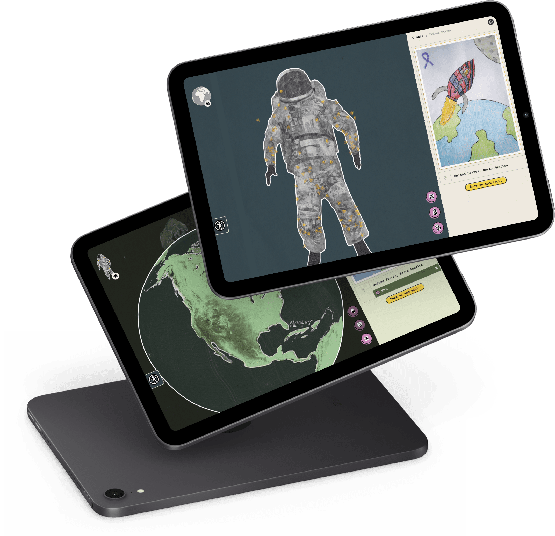 The BEYOND Spacesuit Interactive is a website created for the Space for Art Foundation by my team at Moving Labs. The foundation approached our team to create a website where kids could interact with a 3D model of the BEYOND spacesuit, a spacesuit quilted with over 800 pieces of artwork contributed by children in hospitals, refugee centers, orphanages & hospitals around the world. The web experience allows kids to browse and view all the artwork by interacting with a 3D model of the spacesuit and the globe.