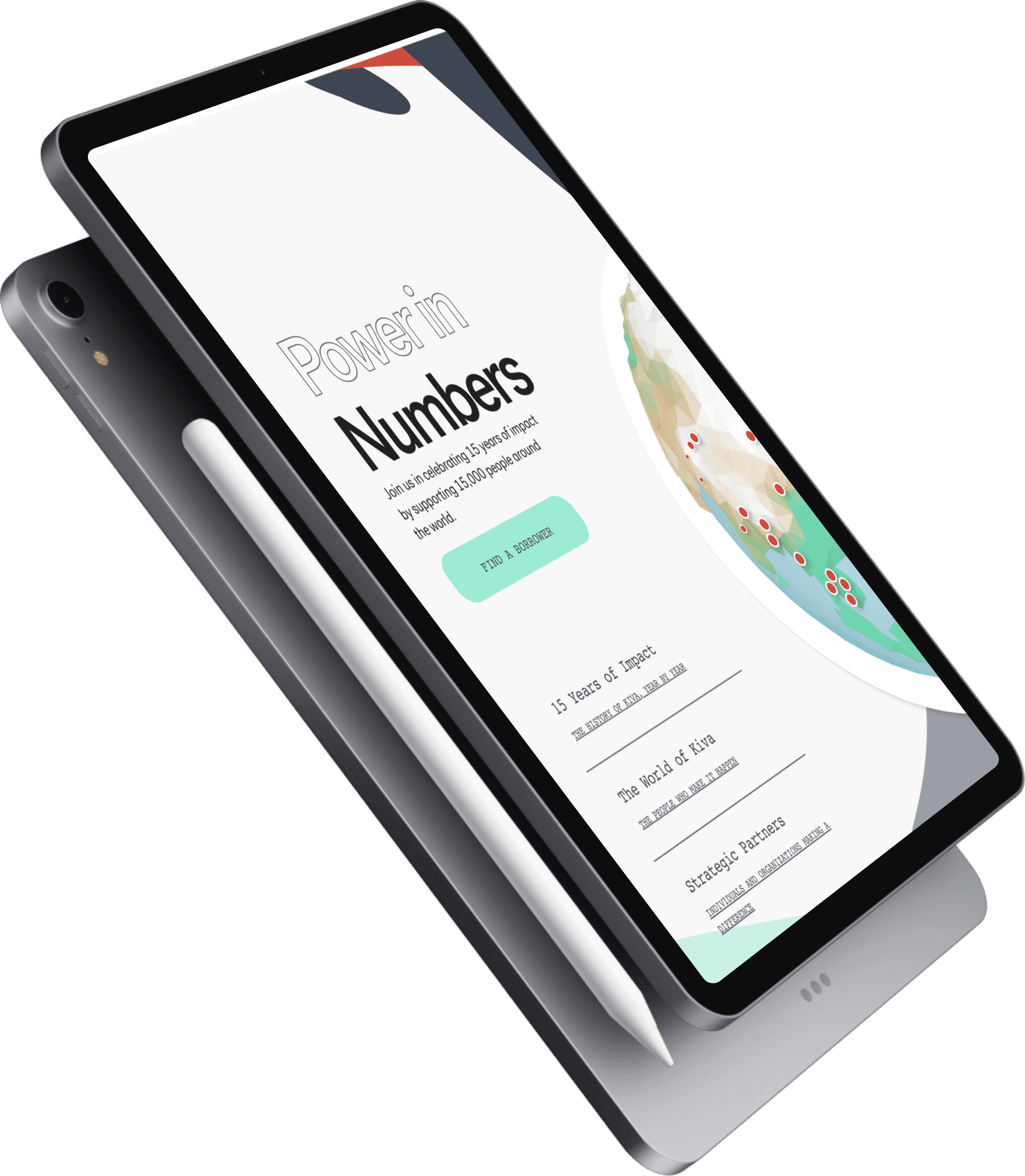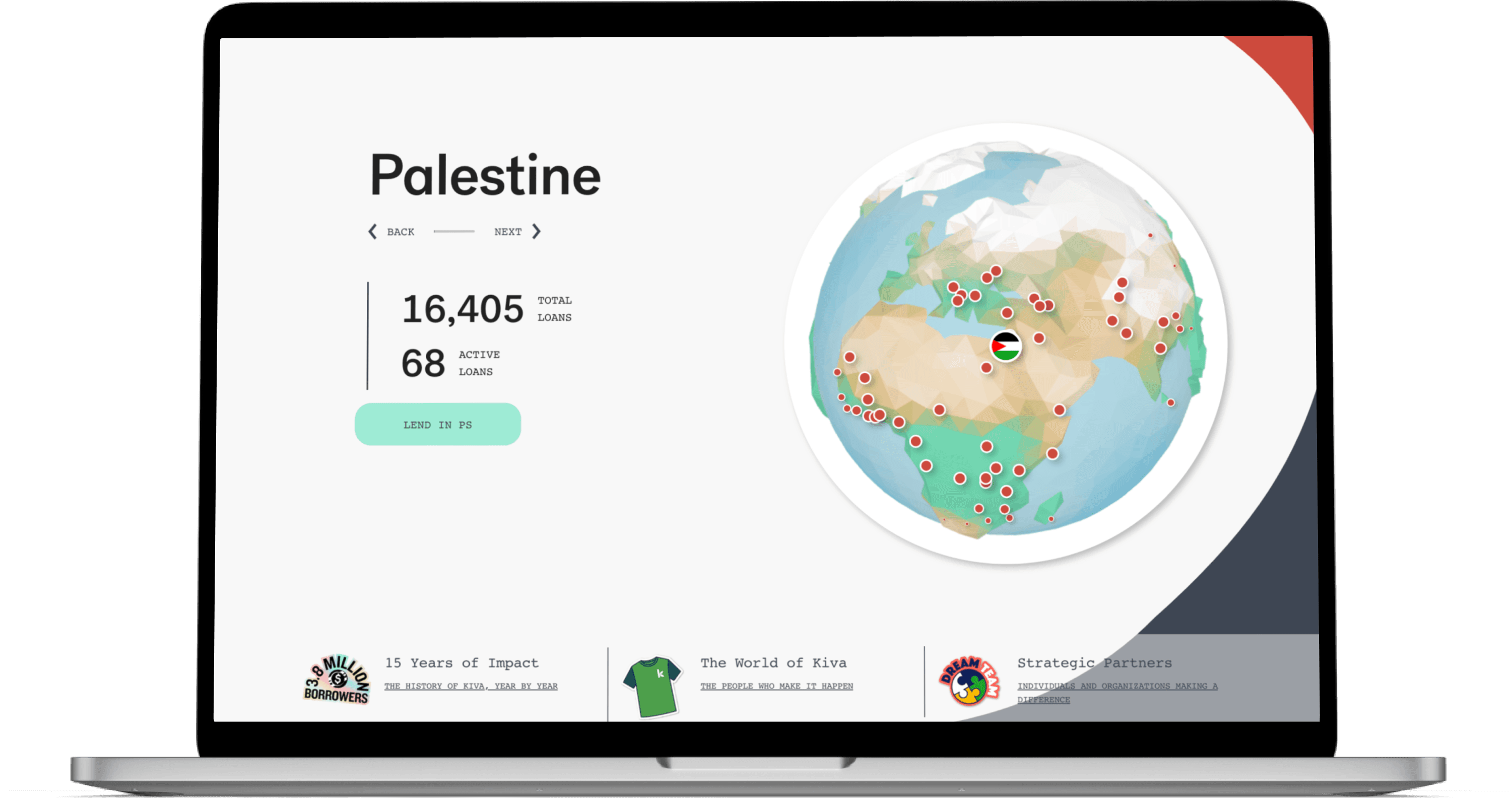 Kiva is a social lending platform which allows people to lend money electronically to low-income entrepreneurs and students in 77 countries. Throughout their 15-year journey, they have facilitated funding for over 15,000 entrepreneurs from all over the world! To share their unique achievement, they wanted to showcase the impact that they've had on a global scale - and what better way to show that than a globe! In fact, they reached out to Rally Interactive especially for their GlobeKit product is a slick and full-featured interactive globe library built in WebGL.